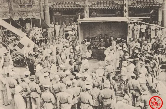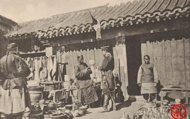 图中这一摊子铜铁陶器摆得满当当,前头这个穿军服的洋人正同摊主说话,木门斑驳,屋檐瓦当压着灰尘,旗子在檐下晃呀晃,两人你一手比画我一手掐价,像极了过年置办年货的架势,只是口袋里的银钱从哪来,摊主心里门儿清,先乱世后规矩,等能明码标价时,城里已经换了模样。