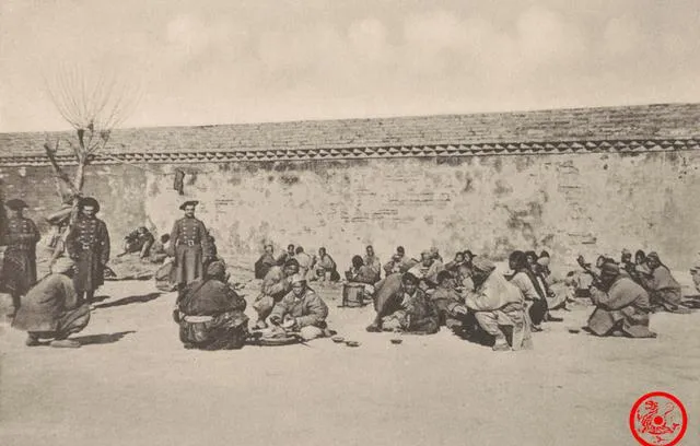 这一片空场上,人都蹲着或半跪着,碗是粗陶碗,勺子敲在碗沿上叮的一声脆,旁边立着拿枪的兵,影子被午后的阳光拉得长长的,饭是热的,人却不敢多嚼两下,赶路、搬运、修桥,碗刚放下又得起身,奶奶说以前赶集都要抄近道省脚力,这些人哪有什么近道,走到哪都是活。