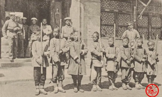 晚清老照片:妇女被逗笑,地方官升堂问案,小朋友接受军事训练。