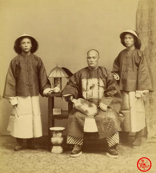 图中这位中间坐着的官儿,身上穿的是绣补子的大袍,胸口的方补一眼看出是有品级的,脖子上一串长长的朝珠,手里还攥着一把团扇,桌上摆盏罩着伞形灯罩的台灯,旁边两名随从垂手而立,圆檐帽压住了发鬓,衣摆整整齐齐,老辈人说,官不在腰,气势先到,这张像片就透着一股威严的静气。