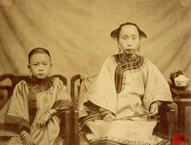 这个装束讲究的女子头戴饰件,肩背纹路细密,衣摆翻出镶边,孩子坐在一旁板着脸,小辫梢抹得顺滑,袖口处的绣线闪着光,外婆看见这张说,这样的衣裳不是寻常人家穿得起的,颜色与纹样都有规矩,按着品级来,现在我们逢年过节挑款式,那时候一线一针都摆在规矩里。