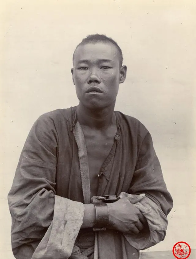 这个男人的表情,说不上来是木还是困,眼神空了一截,手腕上扣着铁镣,袖口翻出来,布边磨起了毛,胸前的衣襟没扣好,露出里头瘦骨嶙峋的一段,照片里没有喧哗,可你能想见围观的目光,他低着头不吭声,像在等什么,又像什么都不等,这一幕搁在如今,镜头会打上马赛克,那时候就是光天化日的一张照相。