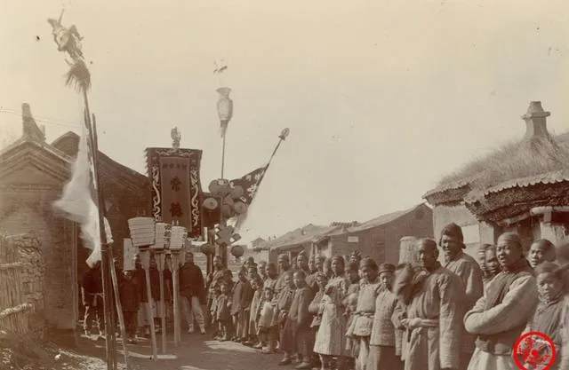 这张像片里旗幡高挂,长长的行列两侧站满人,前头竖起写着字的牌面,旁边立着几根水桶杆子和灯笼杆,听老照片里的老人讲,天津武清一带民间自发的水局就是民间消防,谁家起了火,锣一响,人就冲出来提桶排队传水,那时候没有消防车,靠的是街坊四邻一条心,现在街道上红皮车一响,几分钟就到,那会儿是人挤人的脚步声先到。