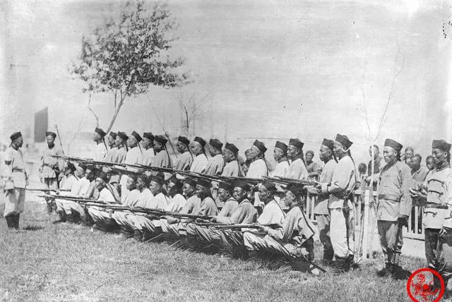 图中排队蹲站交错的是清军士兵,手里一水的长枪,枪托擦得发亮,前排下蹲端枪,后排挺胸瞄准,帽檐一字压着,军容看着不差,爷爷说那会儿新枪新炮往里堆,练法却还老一套,真到了战场上火光一晃就乱了阵脚,子弹哗啦啦打空,等烟散才想起准星在哪儿。