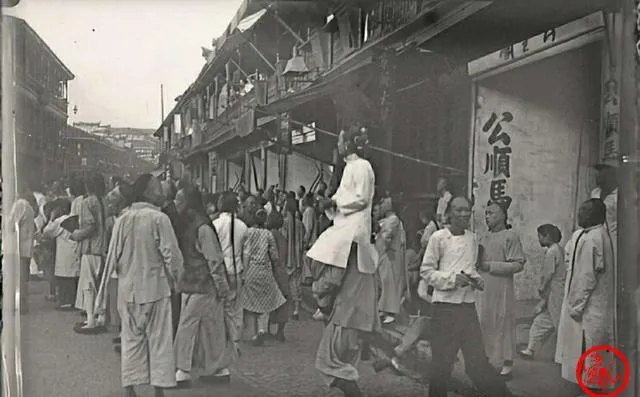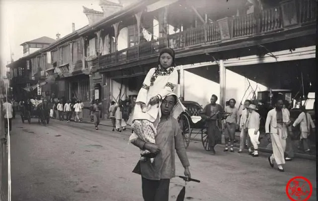 这张是在上海街口,男佣背着缠足的女子穿人群而过,女子头面鲜亮,袖摆一动一动,像戏台上走位,为什么不坐轿子,书上写得明白,后期收“曲户轿捐”,为省钱就改成让龟奴背,奶奶小声嘀咕过,背得稳不稳要看力气,女子一只手还要按着他的头,生怕栽下去,热闹的街上,人看惯了也就不惊奇。
