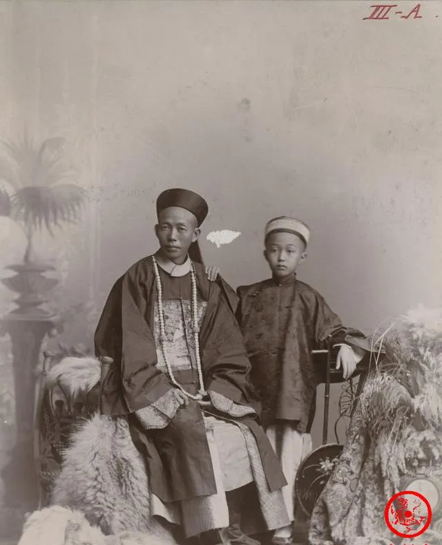 这对父子坐姿规矩,长袍马褂整整当当,桌布是兽皮,背景是照相馆里常见的植株与帷幔,硬朗的相纸边上还写着编号,听说这位父亲做的是大买卖,跑南洋也跑祖国的公益,照片里看不出钱气,倒看得出一种稳,家里老人常叮嘱,“有本事的人,合影也不抢镜。”