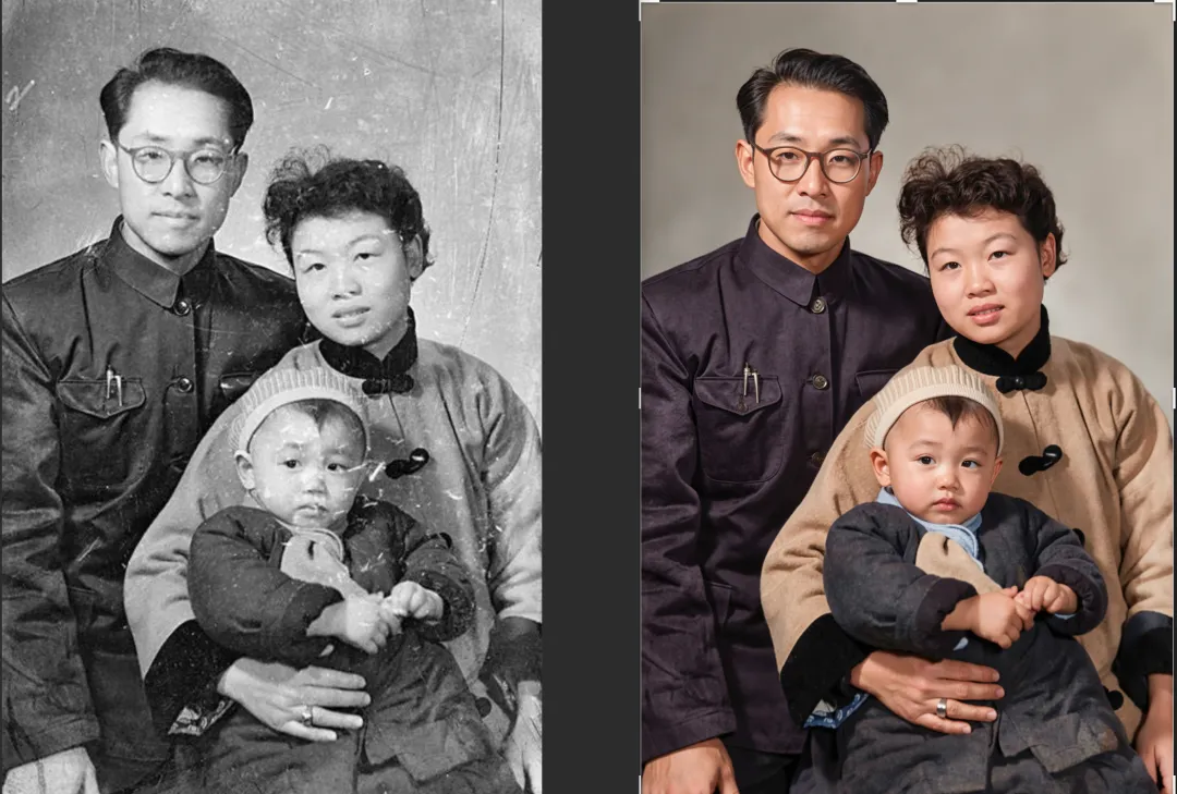 老照片修复,面容生动自然,肤色红润,柔和光线,高清,8K的效果。”随便在网上找一张老照试一下效果。