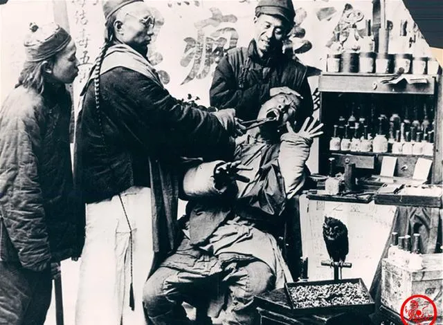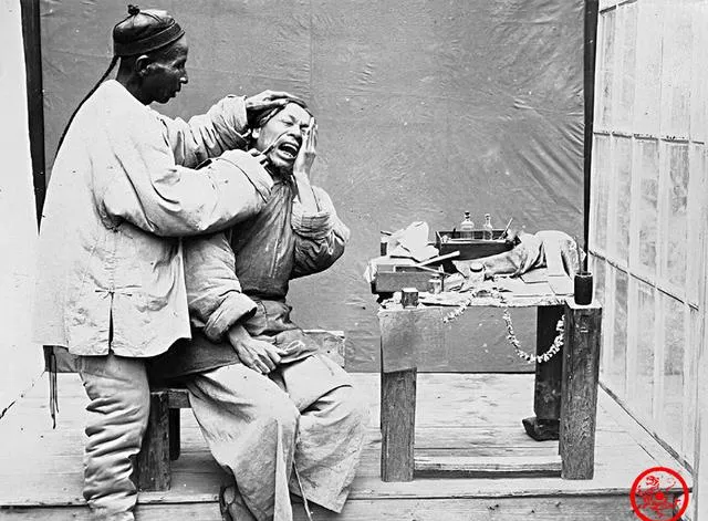 老照片:晚清牙医在街头用老虎钳拔牙,病人痛到变形。