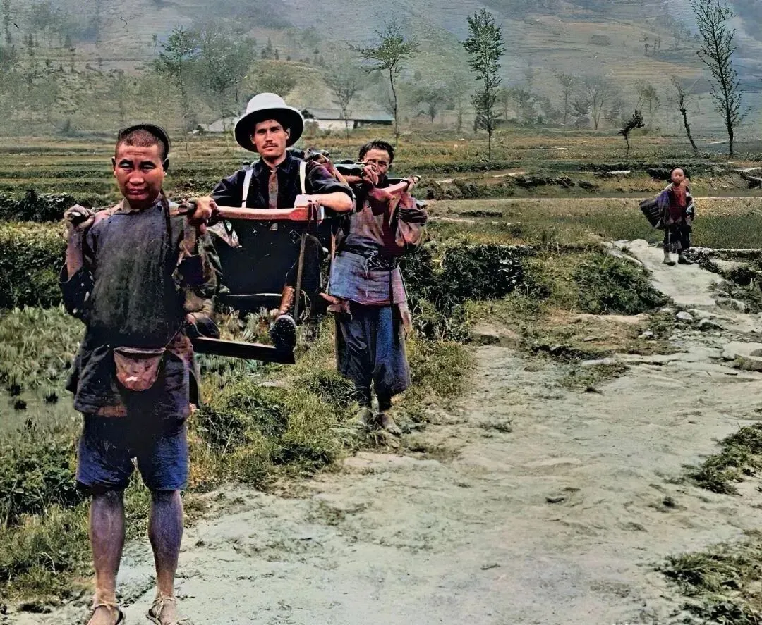 两个穿着草鞋、面露疲惫的轿夫抬着一个洋人走在乡间的小路上。右上角还有两个孩童好奇地张望着。