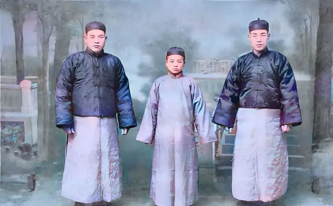 中间的少年即将要去远方就读,他的父亲和叔叔带着他到照相馆合影留念。