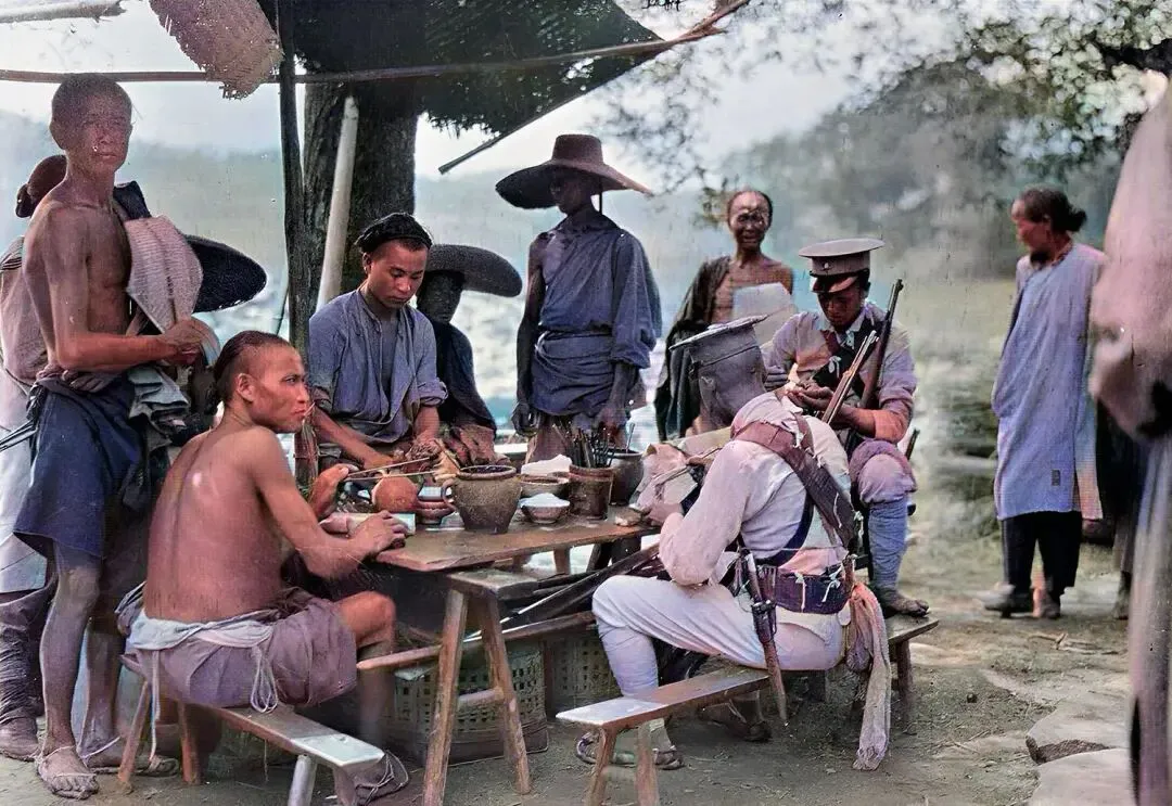 两名北洋军士兵跟老百姓一起在路边的小吃摊上吃饭,这两名士兵跟周围的老百姓一样穿着草鞋。