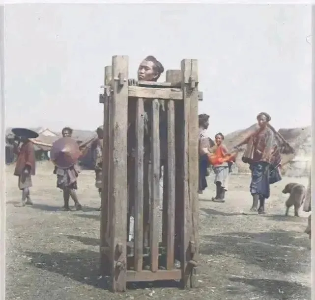 一名囚犯被关在囚笼里示众,这种囚笼被称为站笼,站笼上面的木板卡着囚犯的脖子,囚犯脚下放着砖头,惩罚的轻重和囚犯苟延性命的长短,全在于抽去砖的多少。
