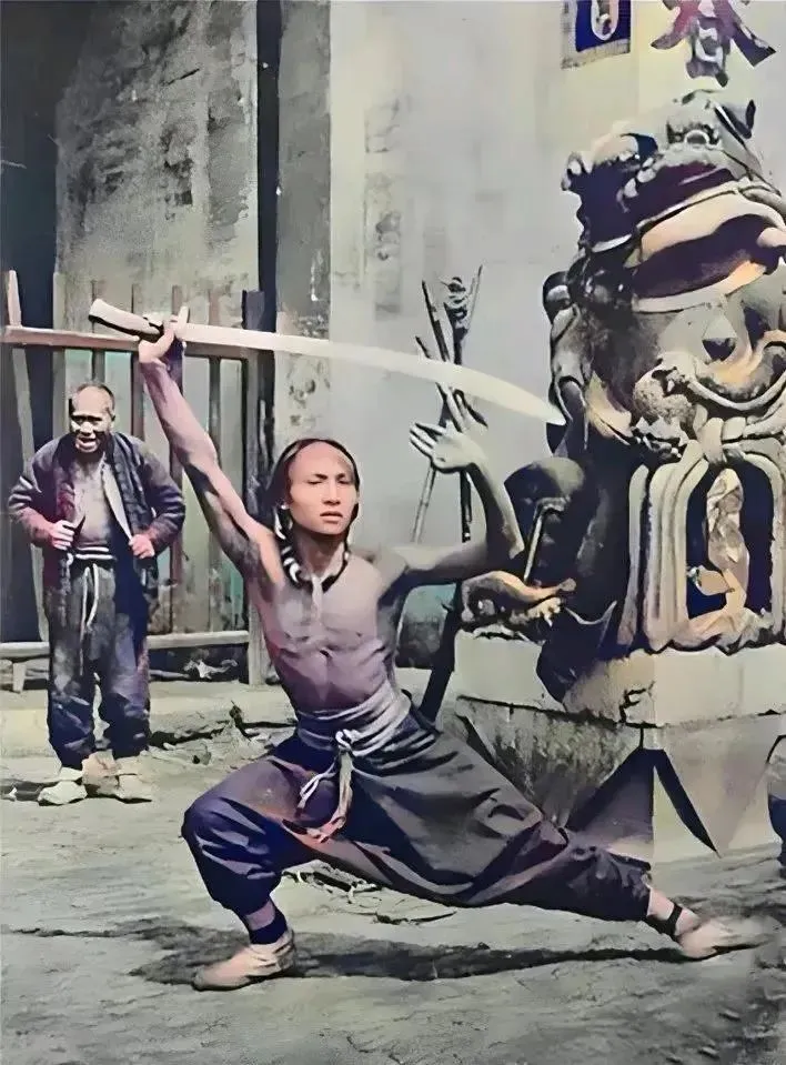 武者在武馆外展示他的刀法,看他的架势应该是有些真功夫。不过这种功夫在面对热武器的时候也只能是不堪一击。