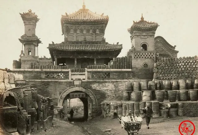 图中的城门叫彭城东阁,也有人喊玉皇阁,砖石砌成的台基厚重结实,阁顶堆叠着兽吻和脊饰,左右立着钟楼鼓楼,气派不输城隍庙,城门洞里进出的人影被拱券切成一截一截,门外路边堆满了大缸与坛子,口沿厚厚的,釉色暗沉,像刚从窑场里挑出来的残次品,奶奶曾说彭城一带瓷火兴旺,手一摸尘土里都是瓷渣粉,照片里这阵势,像极了窑场忙季的余温,现在城门多修成景点,缸坛变展品,摸不得也搬不得,只能远远看着叹一句年代变了。