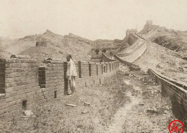 这段长城多半在北京附近,城砖风化起毛,女墙有缺口像被风一口口啃掉,一个男人倚着堞口往远处瞧,眼前都是秃岭和浅草,小时候我跟着家里去郊外,老人总说以前砍柴不眨眼,山皮就这么秃了,现在种树成林,长城变得更好看了,可这张旧照留住了当年的凌厉,没遮没挡的天和风,仿佛一吹就起砂。