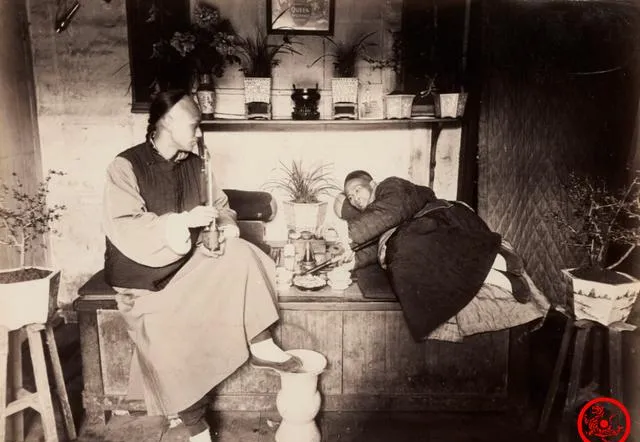 这幅里头的两位臭男人躺在烟榻上,一个端着水烟,一位揪着长长的烟枪,烟灯一点就亮,火光像鬼火似的在铜托里跳,吸一口吐一口,屋里挂起淡黄色的雾,彭养鸥写过夜里东一张西一铺的景象,真不是夸张,爷爷说那阵子有人一沾烟就丢了魂,家里米缸见底也不肯停,这东西来得快去得慢,照片把那股子迷糊劲全收住了,现在我们讲健康和戒断,街角也不许随便点火,这么一对照,才知道旧时的放纵原来这么近又这么远。