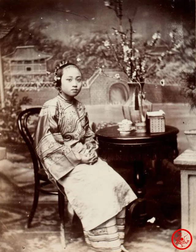 图中这位穿着绣纹长袄的年轻人家,是大户人家的小姐,缎面在灯下反着亮光,袖口滚着花边,耳畔别着小小的点翠,姿态端着却不僵,桌上一盏茶盏配着插花,细看她脚下,真有那双三寸金莲,奶奶曾叹气,说当时讲究这种美,走起路来一步一步像踩在棉花上,旁人看着风雅,她自己受着劲儿,现在我们爱穿运动鞋,讲究舒服和利落,想起当年这等束缚,只能说审美也会误人。