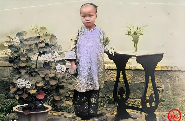 图中这位小朋友穿着细密纹路的长袍,袖口和衣襟都起了边,头上前额剃得光溜,后面留着一绺细辫,旁边一个小几上摆着花瓶,站姿板板的像被大人叮嘱了半天才肯不乱动,他的表情严肃得很,像在心里问一句拍完能不能吃点糖。