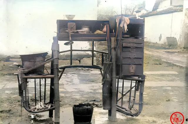 这个家伙是晚清的“移动厨房”,两头铁架一肩挑,中间横着木板与炉灶,前面挂着铁锅和调料罐,背面一层层抽屉用来装食材,底下还有个小火盆,摊主走到哪火就生到哪,停下来就能现炒一份,竹制架子外裹着一层油泥,黏乎乎的看着不太卫生,可胜在灵活,来一位客人就能开张。