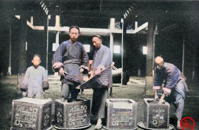 晚清彩色老照片:工人封装茶叶直接用脚踩,皇宫太监衣着华丽。