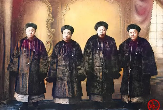 这四位站成一排,皮帽压得低低的,身上穿着厚皮裘,脖子上垂着长串珠链,背景是摄影馆的彩绘幕布,规整而拘谨,妈妈指着说,这样的合影放在堂屋就是面子,读书人走到这一步不容易,科举那条独木桥走到头,后头升迁快不快看运气。