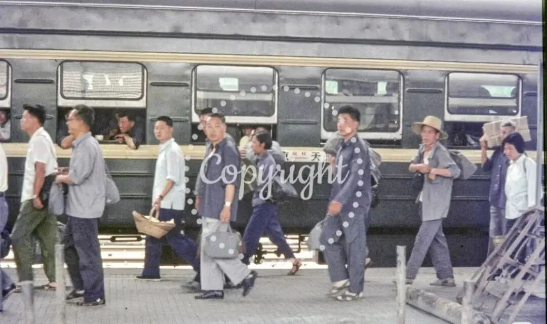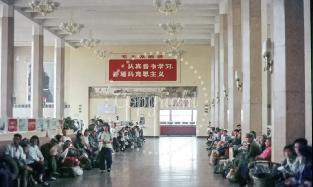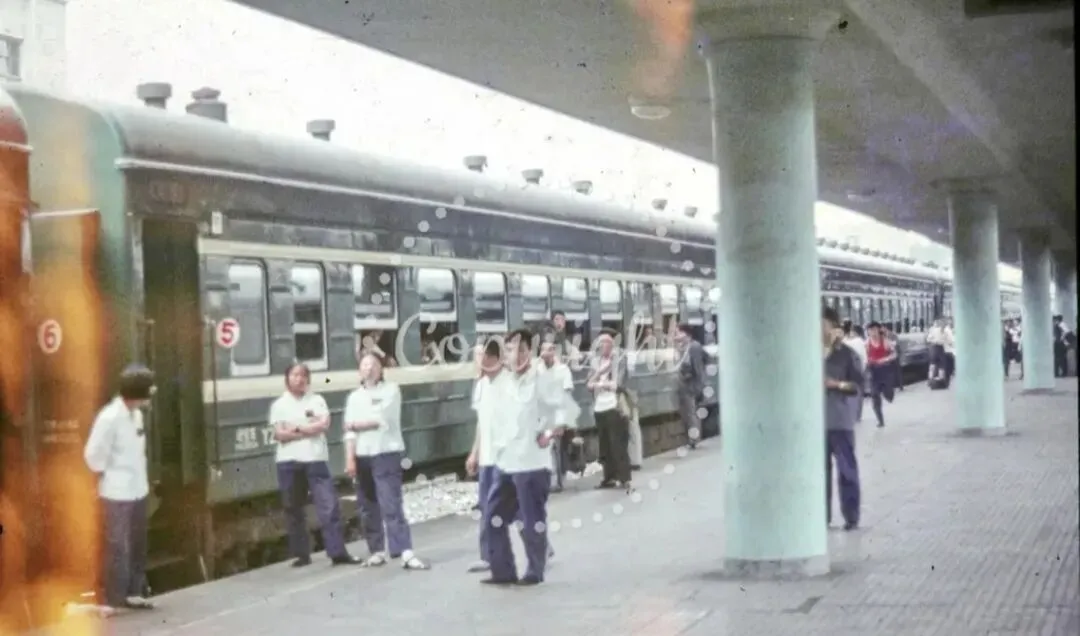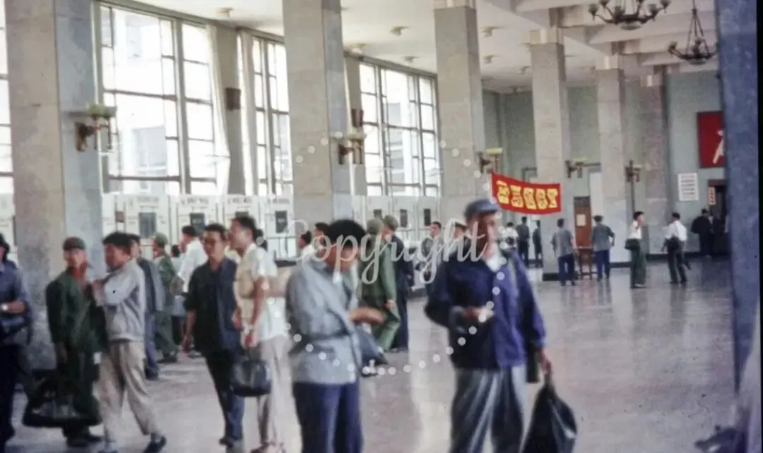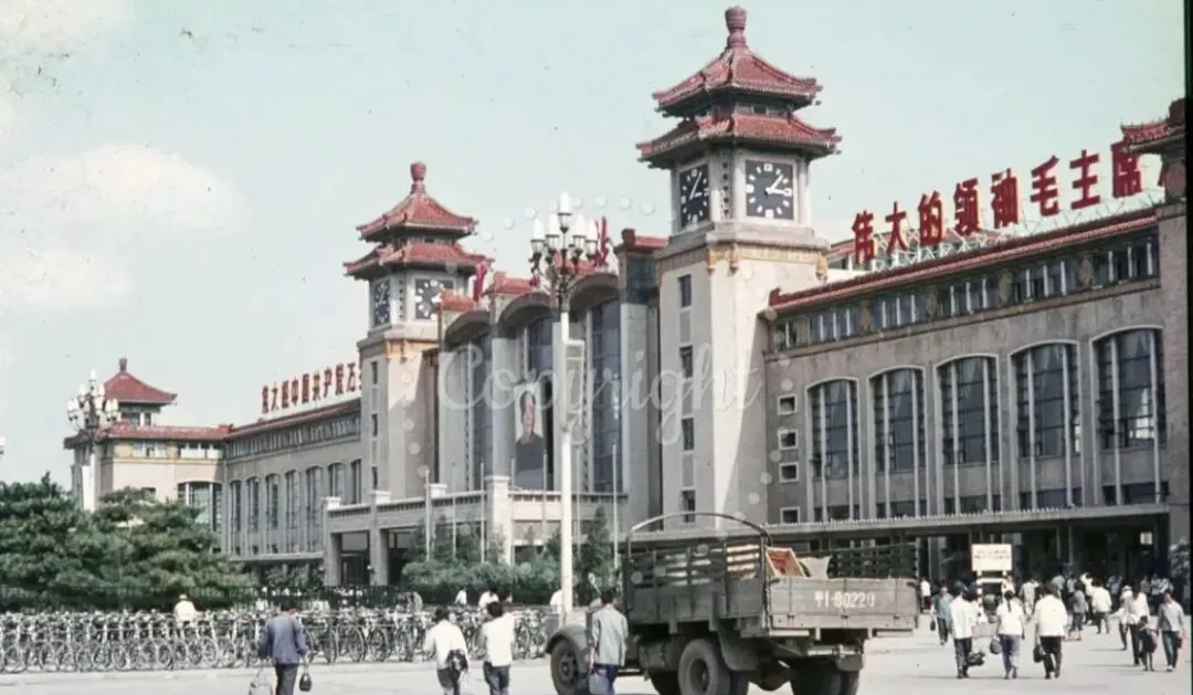 那会儿的北京站,妥妥的北京地标。城楼式的钟楼立在那儿,气派又庄重,墙上的标语清晰醒目,是独属于那个年代的鲜明印记。
