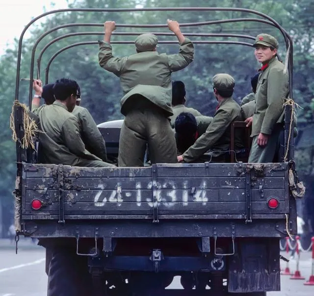 图中这辆敞篷军用卡车,铁栏弯成弧,尾板刷着白字,车厢里挤满了年轻人,伸手抓杠的人笑得爽朗,风从脸颊掠过去,人就有了要去远方的劲头,妈妈说那时候赶集拉活常搭这种车,抖几下灰尘,整个人都像被风吹亮了。