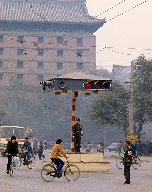 这座岗亭立在路中央,红黄绿灯并排,旁边站着笔挺的交警,路上都是自行车,车铃叮当脆生生,爸爸说以前看岗亭就像看戏台,大家都照着手势走,虽简单却有秩序。