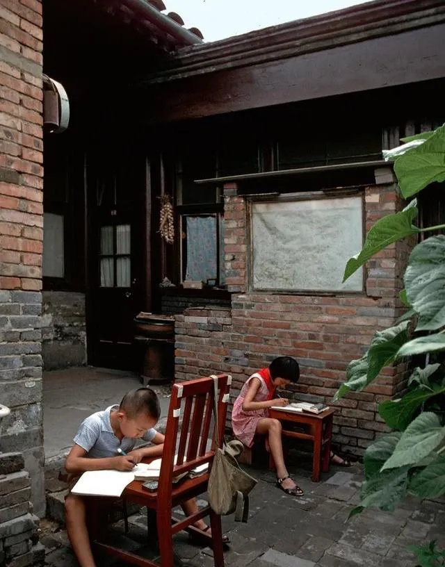 两把木椅一张小桌,老墙边的葫芦藤伸过来,孩子埋着头写字,铅笔尖蹭过纸面沙沙作响,太阳一挪影子就换个角度,写到晚饭点,妈妈在门口喊一声,收本子咯。