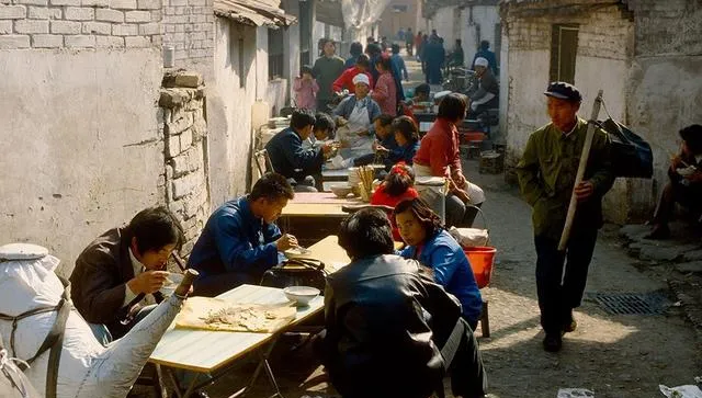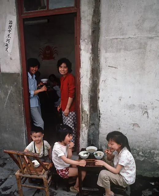 这张最有烟火气,小板凳围着小桌,碗里热气往上冒,屋里人端着碗探头聊天,墙上的贴纸已经褪色,饭香一出来,巷子就成了餐馆,以前吃饭不讲仪式,现在讲究多了,倒没了这股自在。