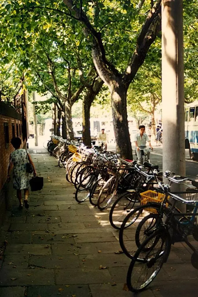 人行道上放满了自行车,七八十年代中国拥有世界上最多的自行车,当时中国被国外称为自行车王国。.............................................................
