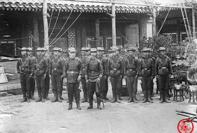 图中这群军士的阵脚站得齐齐整整,胸前别着牌饰,腰间束带发亮,帽檐压得低,手里握着枪或刀,一看就规矩得很,爷爷曾指着类似的照片说,这是肃毅卫队,人数二十来个,隶属武卫军的可能性很大,名字里的“肃毅”二字,是从主子的封号上借来的排场,细看衣料偏厚,纽扣大,腰封紧,站在院子的青砖地上,脚边的影子是硬的,阳光也是硬的。