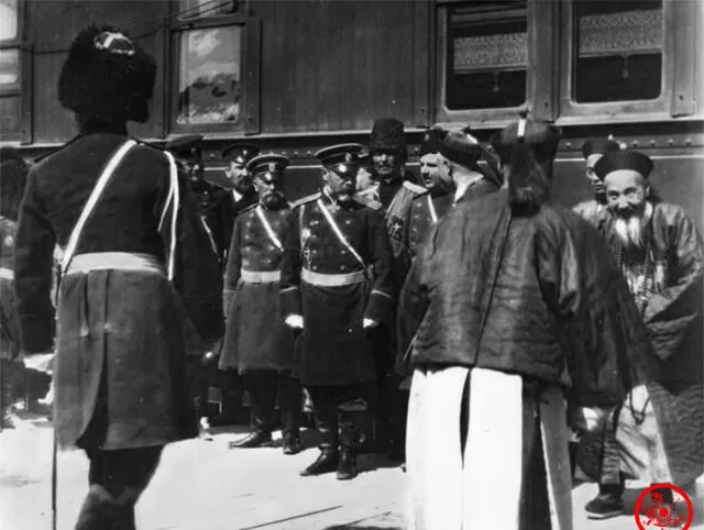 这张是两个清朝官员对面行礼的瞬间,前头留着山羊胡的老头笑得见眉眼,袖子大,脚下站稳,身后是一排穿军装的外国人,帽穗沉,肩章亮,妈妈说,看见没,礼节这东西不分老少,见面先摆姿势,谁高谁低,一看就明白,以前讲究行礼,现在讲究握手,礼数换了样子,含义还在。