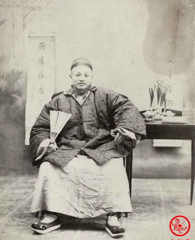 这个人坐在椅子上,一手捏着折扇,一手压在袖口上,肚皮鼓鼓,脸上带笑,姿态自然,像常来照相馆的老顾客,桌上摆花,后面立着一轴字,**“心宽体胖”**四个字放他身上很合适,小时候我跟着爸爸翻旧相册,他指着类似的坐像说,看人坐得稳不稳,就知道日子过得稳不稳,这话听着有点玄,回头再看这张,确实有那个味儿。