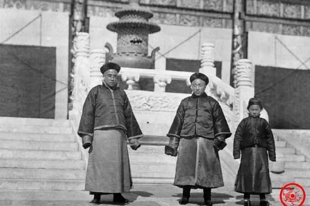 这个场景是在气派的台阶前,石雕、炉台都在背后,三人穿着厚实的袍褂,袖口鼓鼓囊囊,站位有讲究,像是差事在身,脚下的布靴被磨得发亮,爷爷说,以前讲究站相,脚尖别乱动,手袖里藏得稳当才体面,现在拍照随便摆个剪刀手就过关了,那时候的庄重,放在今天看也不违和。