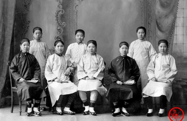 一排女孩坐得笔直,衣服颜色深浅分明,裤脚露出细碎的小花边,脚面上是方头布鞋,表情不躲不藏,有点骄傲的劲儿,老师站在一侧像随时要点名,听过长辈讲,学校不收缠足和已订婚的,那是难得的开风气,现在回头看,端坐的她们像把窗子推开了一条缝,风从那时就吹进来了。