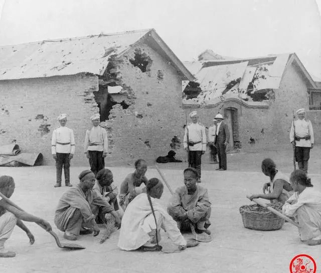 这个屋墙被炮火剜出坑坑洼洼,瓦顶像被掀过一遍,地上落着碎瓦和木板,几个拿着工具的苦力蹲在地上歇气,旁边的人端着枪站着不动,脸上没有表情,战后的修补就像在冷锅里点火,一边修一边怕,手上握的是铁锹,心里装的是日子能不能熬过去。