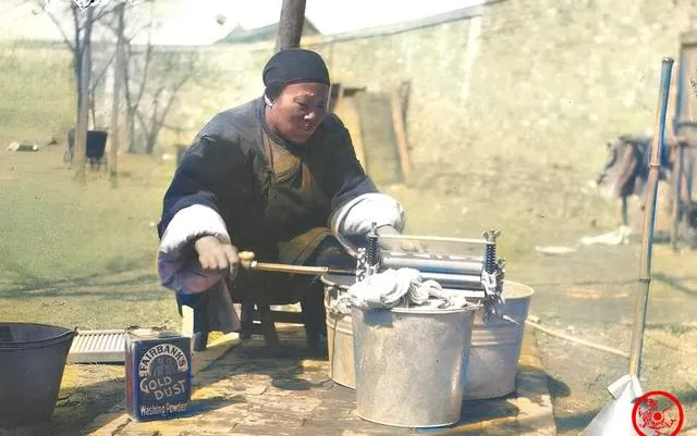 这个铁家伙可厉害,手摇拧干机就摆在石台边,旁边一只大铁桶咕咚咕咚滴水,地上放着“Fairbanks Gold Dust”的铁罐,英文绕口,我小时候还把它当成糖罐呢,妇人两臂裹着厚厚的护袖,咬着牙把衣服送进滚轮里,转几下,水就被挤得一条线似的流下来,妈妈看图笑我,说那会儿哪有洗衣机,手一摇,力气就是科技,现在按个按钮就好,以前得靠臂膀。