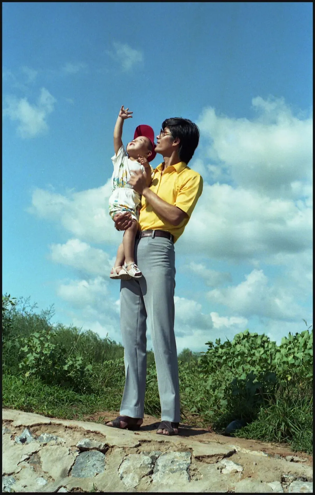 底部是那片农田的绿,那是夏日禾苗涨势茁壮的绿。画面上跳跃着两个最亮的色块:郭梦头上那顶遮阳帽的红色,如同生命最初迸发出的火苗;我身上那件T恤的明黄,则像一束来自远方的光。那件T恤的来历特殊,是奶奶从海峡对岸宝岛台湾带回来的,包括我身上那条布料挺括,垂吊性极佳、弹性又极好、穿在身上很是舒服的灰色长裤。在九十年代初,这抹亮黄以及这条裤子不止是时髦,更像一个符号,一个来自“另一边”的、关于另一种生活想象的信号。它与其说是穿在我的身上,不如说是呈现在了一个时代青年的憧憬之中。