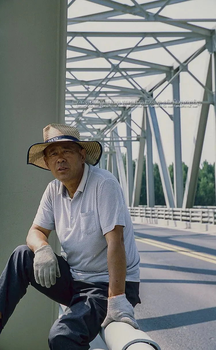 赵衍芳,67岁,和工友一起在G105京珠公路平阴黄河大桥上做检修。