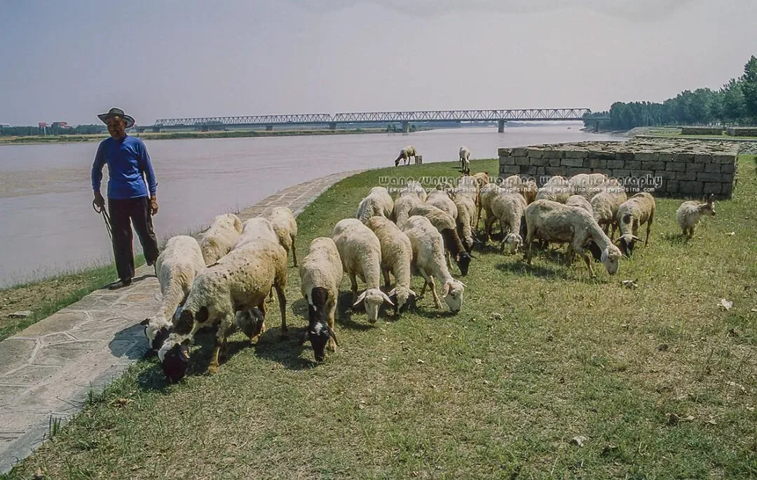 龙桥村的赵老汉在黄河河堤上放羊。