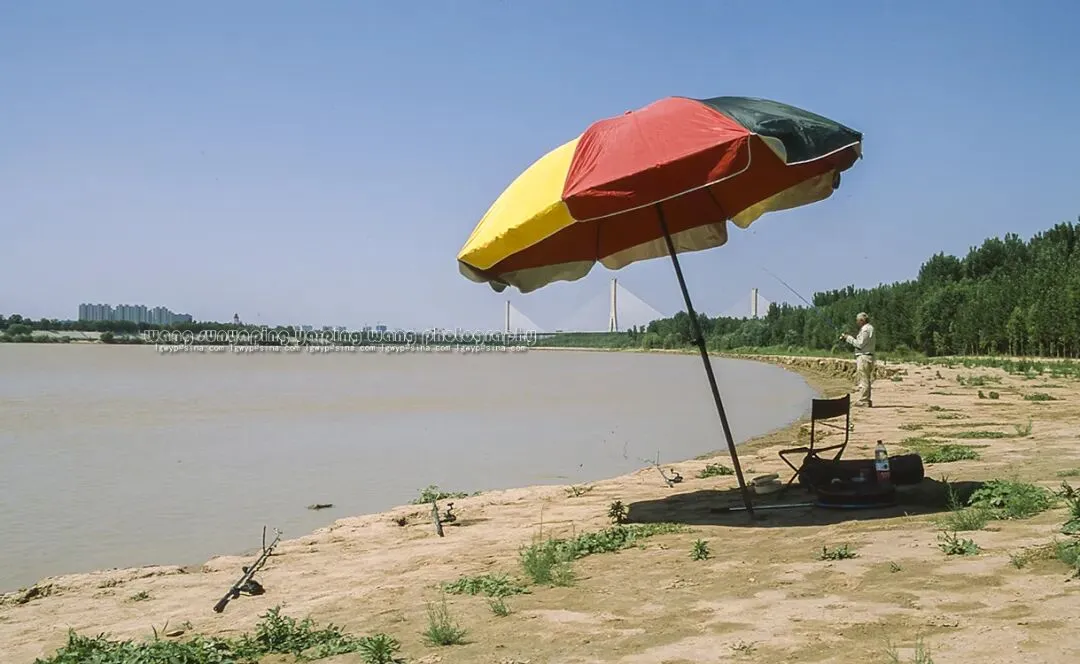 建邦黄河公路大桥下游,在黄河边顶着烈日的钓鱼人。
