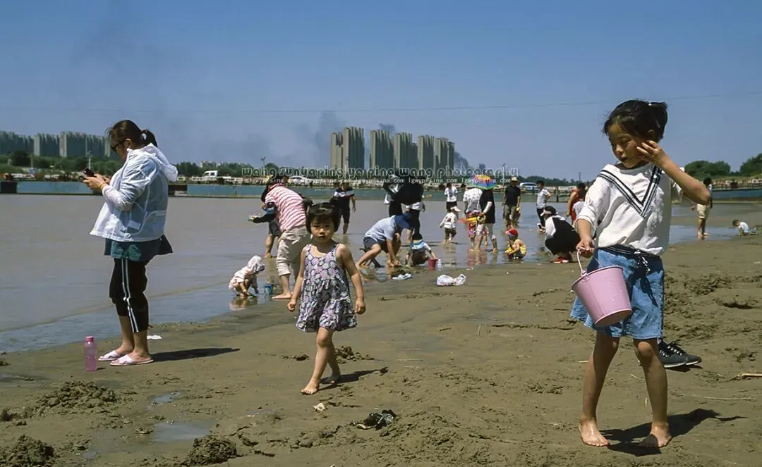 泺口浮桥旁,家长带着孩子在河滩上戏水玩泥,享受着河水的清凉。