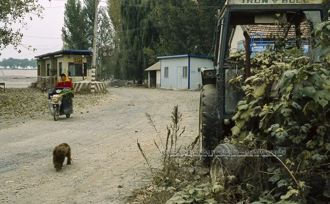 西兴隆浮桥公司驻地,沙土的道路上落满了秋叶,一只小狗在路边觅食,收费处里的收费员静侯着过往的车辆。破败平房的山墙边,停放的拖拉机上爬满了野草。