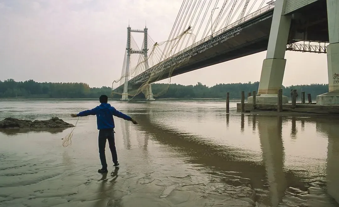 在济南黄河公路大桥下撒网捕鱼的人。