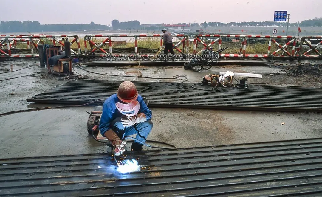 济南船厂的职工正在焊接浮桥跳板防滑钢筋。