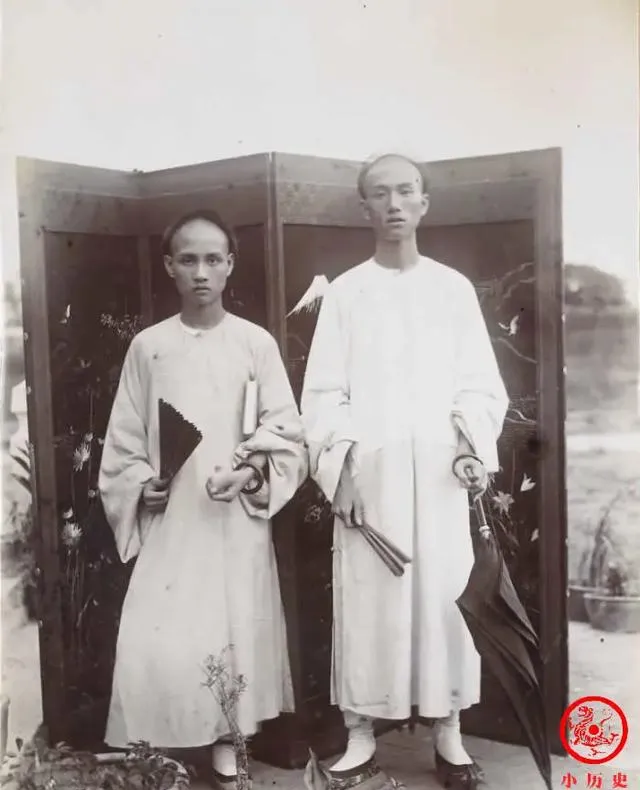这个场景是新式学堂的学生合影,长衫宽袖,手里一个执扇一个拿伞,站在折屏前显得拘谨又得意,学的多是工程学和算学,新东西来得快,家里人念叨读这个有出息,回家能修房架桥,和过去背四书五经不一样。