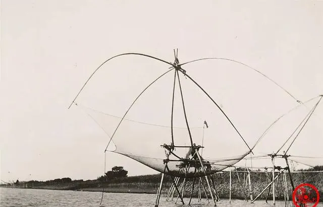 这架子叫搬罾,四根长篙撑开网面,水下静静铺着,等鱼群从头顶过,岸上一吆喝,几个人合力一抬,水花哗啦一下炸开,网里就亮闪闪,小时候跟着河堤跑,最喜欢看这一抬一落,手上甩着滴水的草绳,鱼腥味混着泥土味,今天河道装了护栏,电动船来来去去,这样的手抬网少见了。