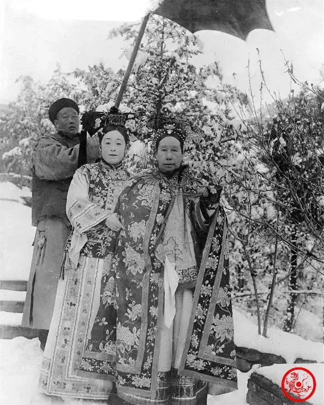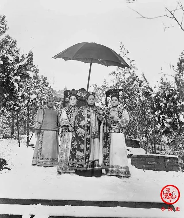 晚清老照片:慈禧太后在宫女陪伴下踏雪赏梅,女子年轻貌美缠小脚。