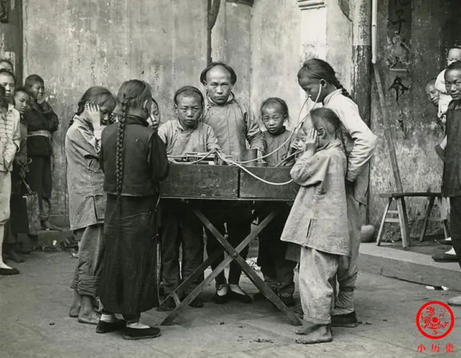 街头商贩弄了一台类似留声机一样的机器,能发出悦耳的声音,孩子们戴上“耳机”听得入迷。这个玩意儿在当时有点科技含量,比较能吸引孩子们的关注。